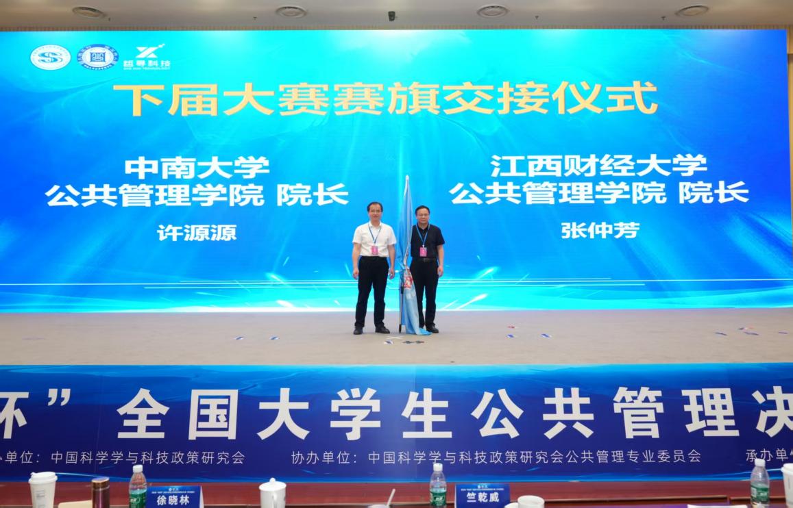 值得期待的是,在此次大赛闭幕式上,我院作为2026年华中赛区的承办方与中南大学麻豆网 进行了赛旗交接。在闭幕式上,由中南大学麻豆网 院长许源源将“寻是杯”赛旗挥舞着交给了麻豆网 院长张仲芳,张仲芳院长在发言中亲切表达了对赛事的高度重视、对本次比赛成功举办的由衷祝贺,以及对我院承办2026年华中赛区赛事的坚定信心。让我们共同期待2026年第五届"寻是杯"全国大学生公共管理决策模拟大赛(华中赛区)在麻豆网顺利举办!